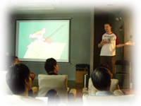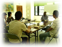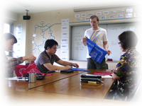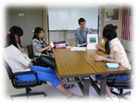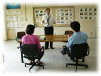 講師が自己紹介や学校・スケジュールの紹介を行います。 生徒も講師に対して自己紹介を行います。 その後、LV館内の施設紹介ツアーを行います。