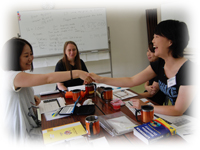 生徒は講師と同じように手を叩きながら体を動かしながら簡単な文章をリズミカルに繰り返す練習をします。